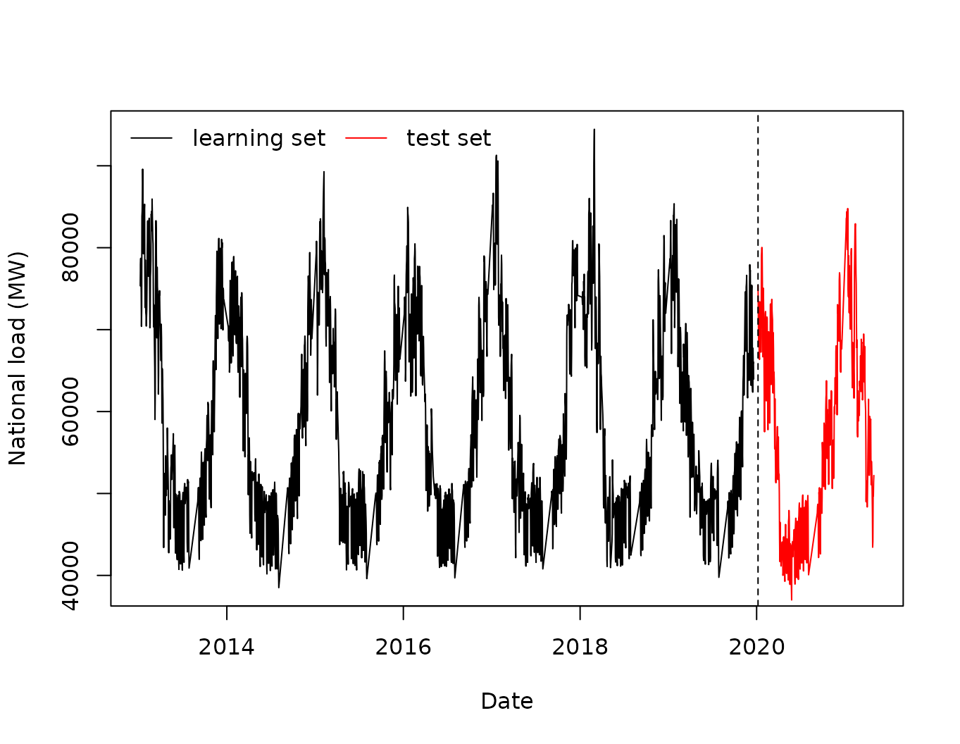 We split the data in 2, the learning set (when we learn the experts) contains the data from January 2013 to december 2019. The test set (when we forecast online) contains the data from January 2020 to april 2021.